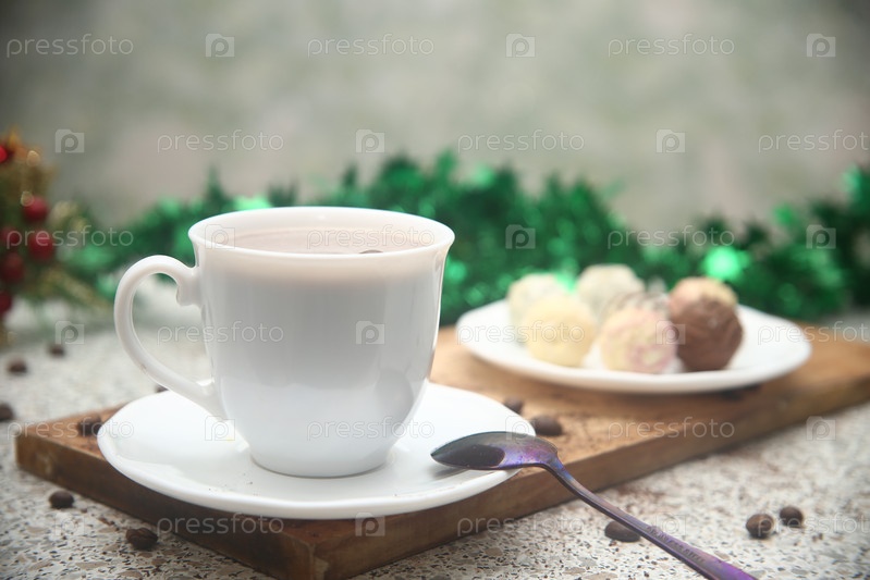 Шоколадные конфеты на доске, чашка кофе и новогодние украшения