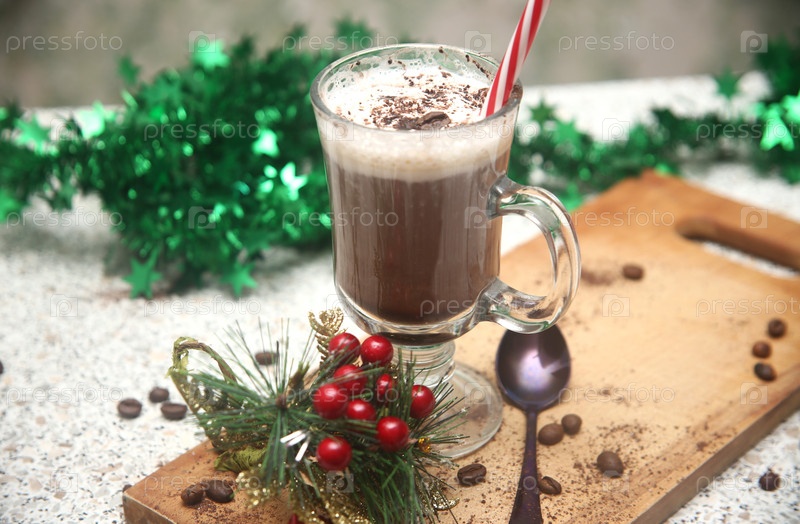 Кофейные бобы, чашка кофе и новогодние украшения на столе