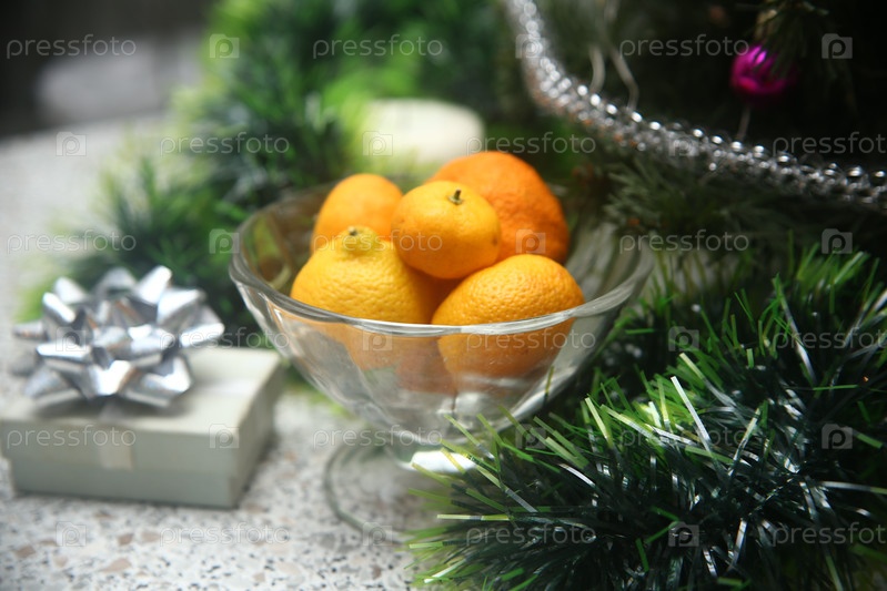 Мандаринки в вазе с тинцелем и рождественской елкой на столе
