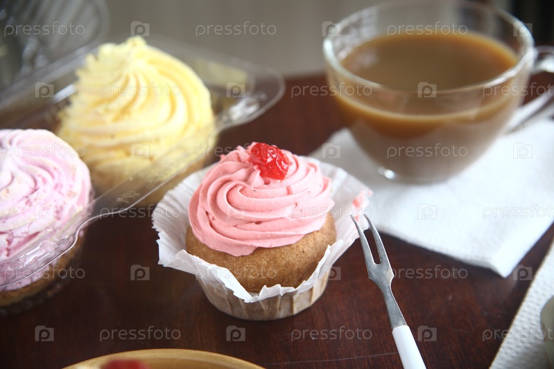 Вкусный кексы с сливками и вишней на столе