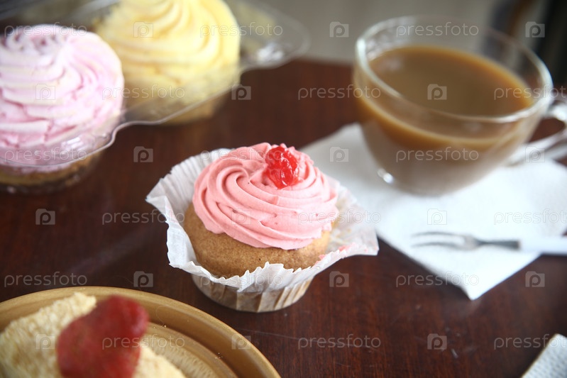 Вкусный кексы с сливками и вишней на столе