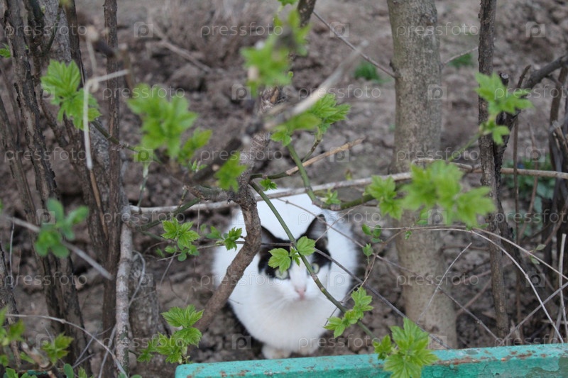 Черно-белый кот под кустами на палочке