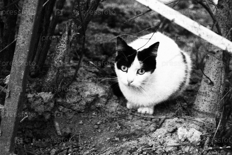 Черно-белый кот сидит на улице