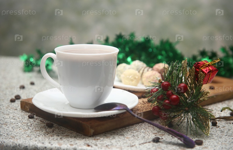 Шоколадные конфеты на доске, чашка кофе и новогодние украшения на столе