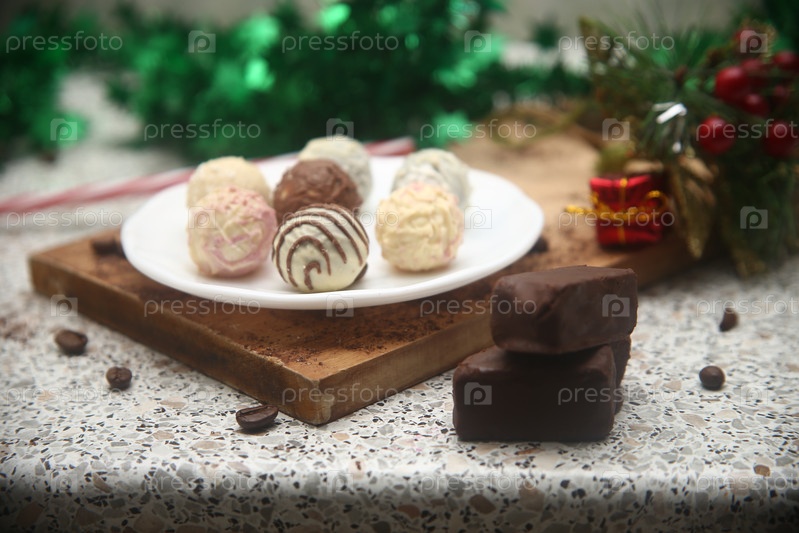 Шоколадные конфеты на доске, чашка кофе и новогодние украшения