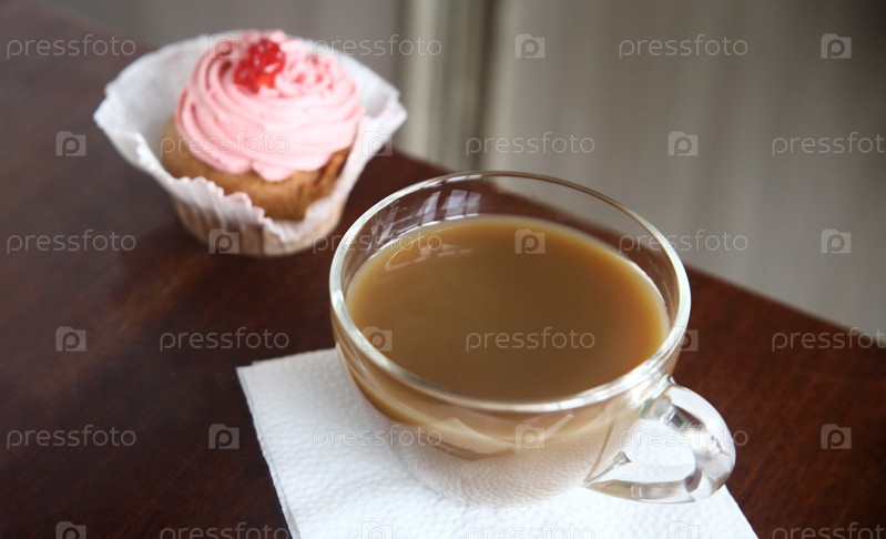 Чашка кофе и кексы со сливками и вишней на столе