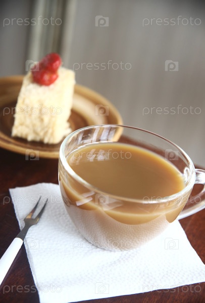 Кофе с молоком и кусок торта Наполеон со клубникой