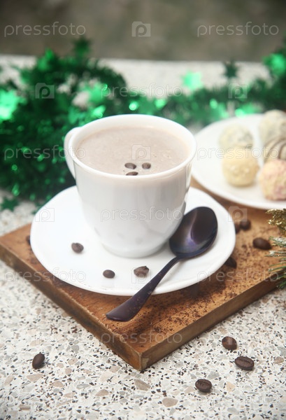 Шоколадные конфеты на доске, чашка кофе с зернами и новогодние украшения
