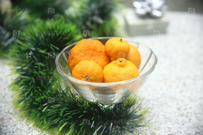 Мандаринки в вазе с тинцелем и рождественской елкой на столе