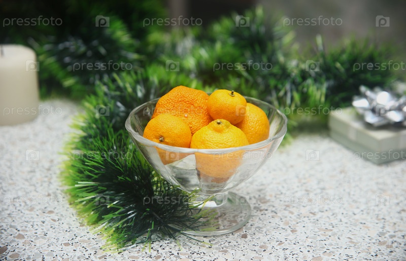 Мандаринки в вазе с тинцелем и рождественской елкой на столе