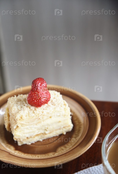 Кусок торта Наполеон со клубникой в тарелке
