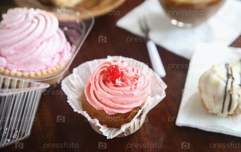 Вкусный кексы с сливками и вишней на столе