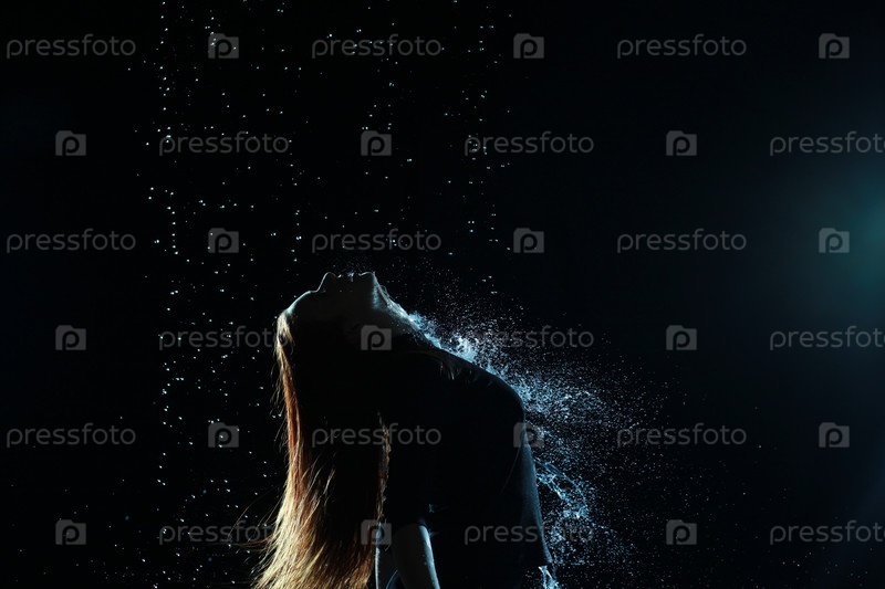 Женский силуэт на темном фоне под капельками дождя
