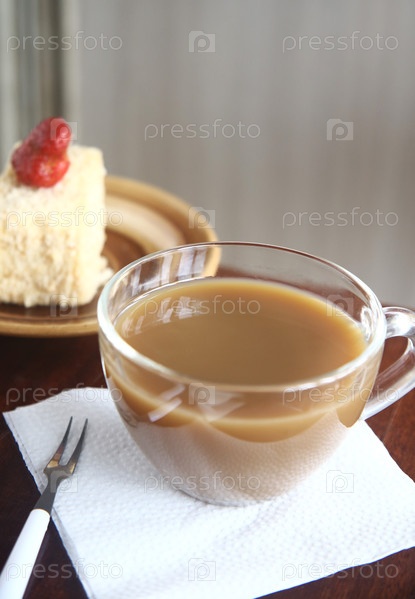 Чашка кофе с молоком и торт Наполеон со сливкой на столе