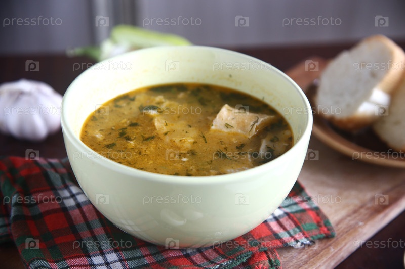 Тарелка супа с чесноком, хлебом и овощами на столе