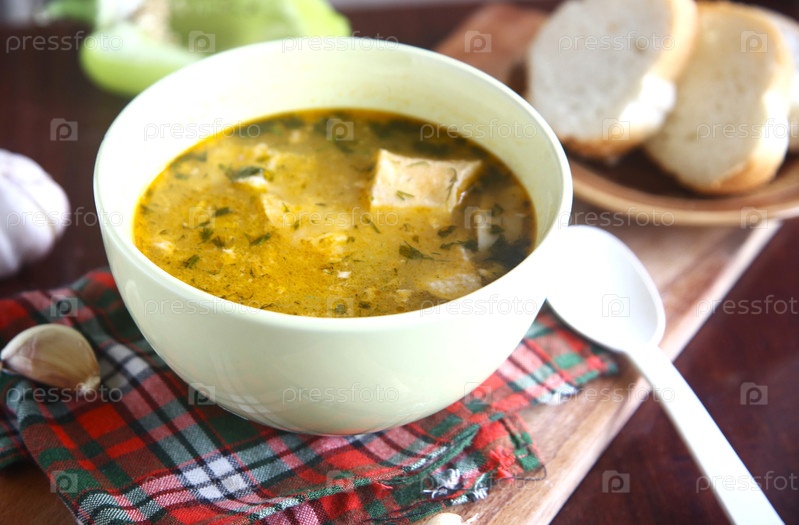 Тарелка супа с хлебом и овощами на столе
