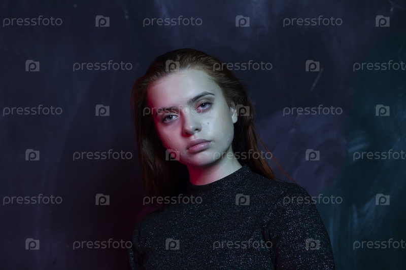 Красивая девушка со слезами на щеках в темной комнате