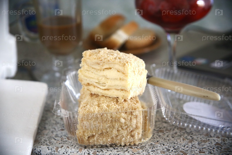 Наполеоновский торт со сливкой на столе