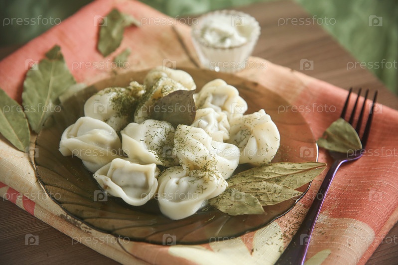 Порция пельмени с лавровым листом и сметаной в тарелке