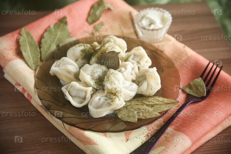 Порция пельмени с лавровым листом и сметаной в тарелке