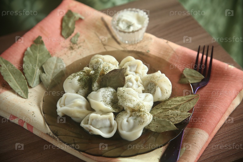 Порция пельмени с лавровым листом в тарелке с сметаной