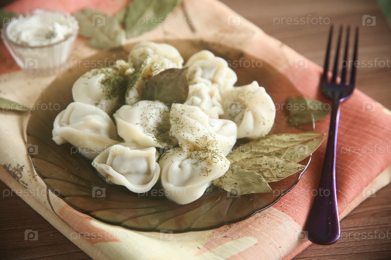 Порция пельмени с лавровым листом и сметаной в тарелке