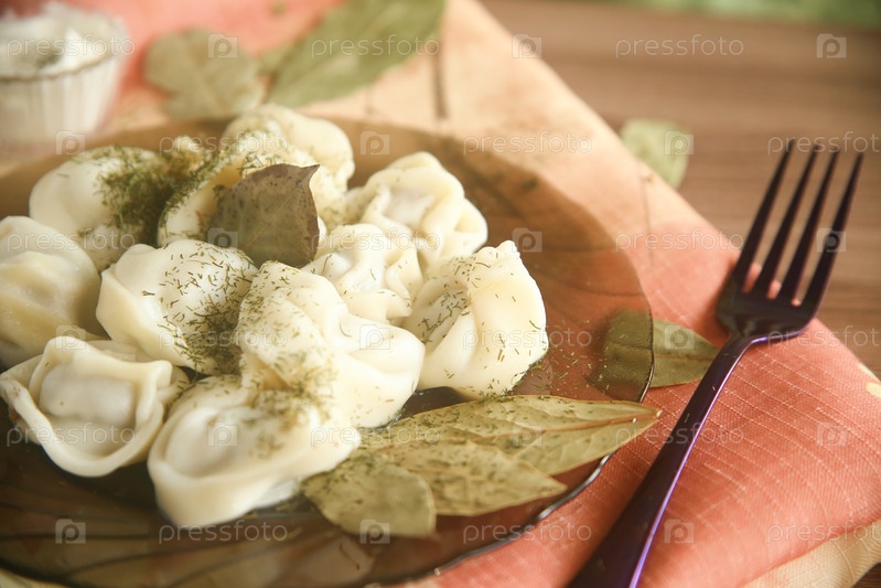 Порция пельмени с лавровым листом и сметаной в тарелке