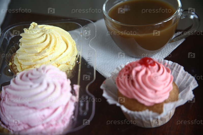 Вкусный кексы с сливками и вишней, а также чашка кофе на столе