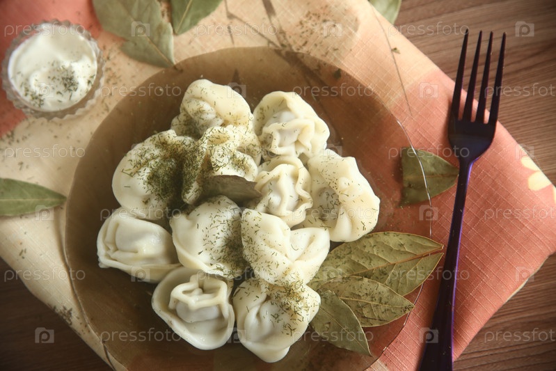 Порция пельмени с лавровым листом и сметаной в тарелке. вид сверху