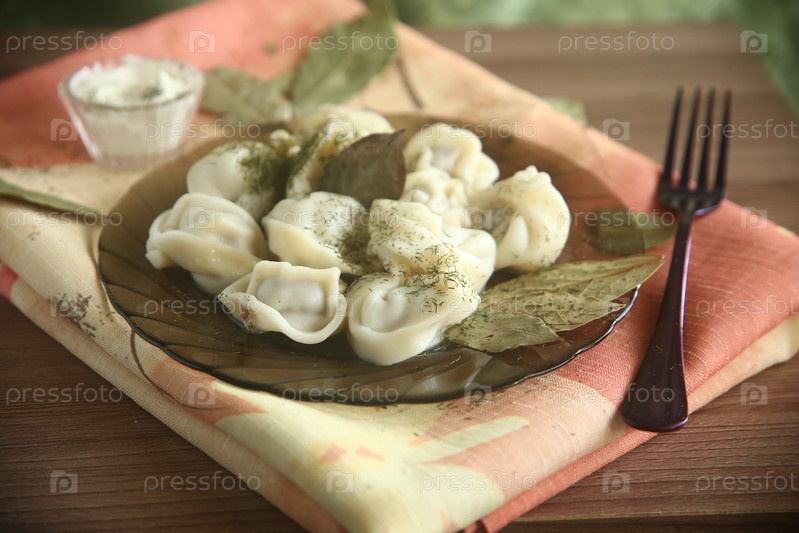 Порция пельмени с лавровым листом и сметаной в тарелке