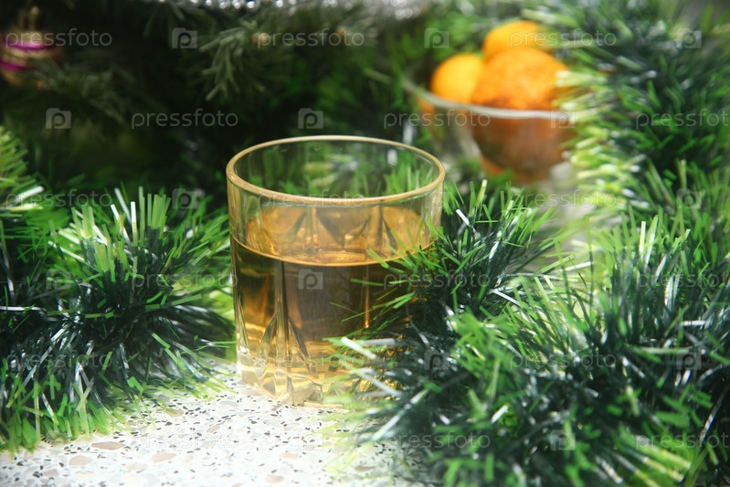 Белое вино с тинзелем, мандарины и рождественская елка на столе