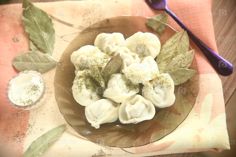 Порция пельмени с лавровым листом и сметаной в тарелке