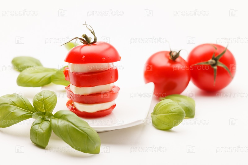 Помидоры и ломтики сыра моцарелла, украшенные листьями базилика