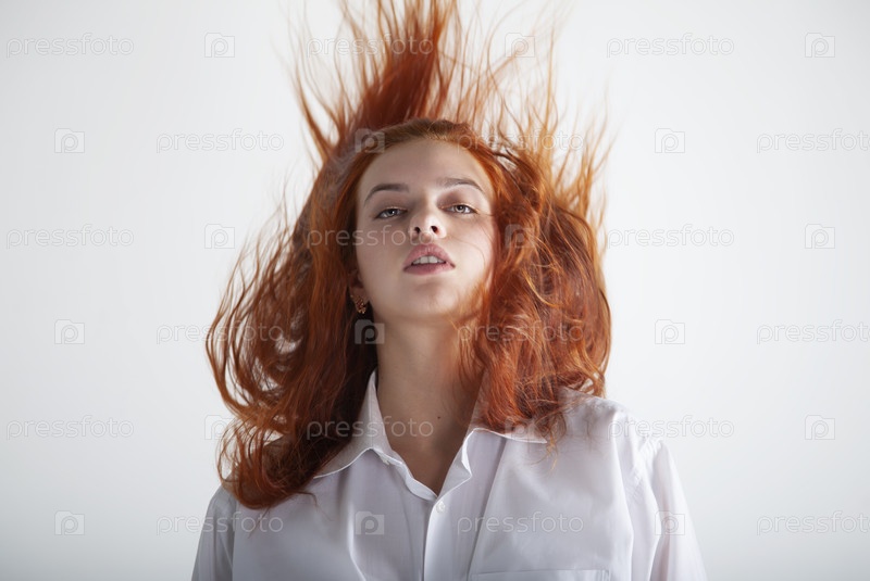 Красивая девушка с рыжими волосами на белом фоне