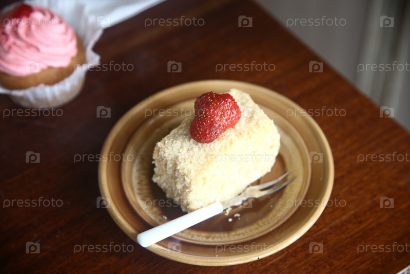 Наполеонский торт со клубникой в тарелке