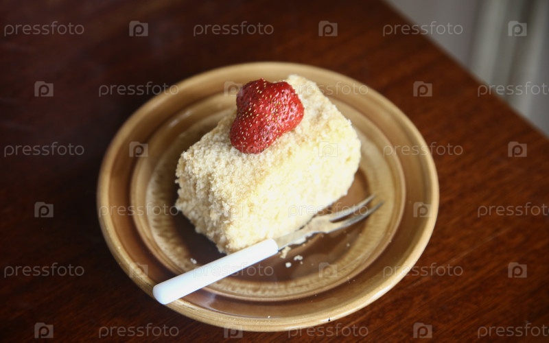 Наполеонский торт со клубникой в тарелке