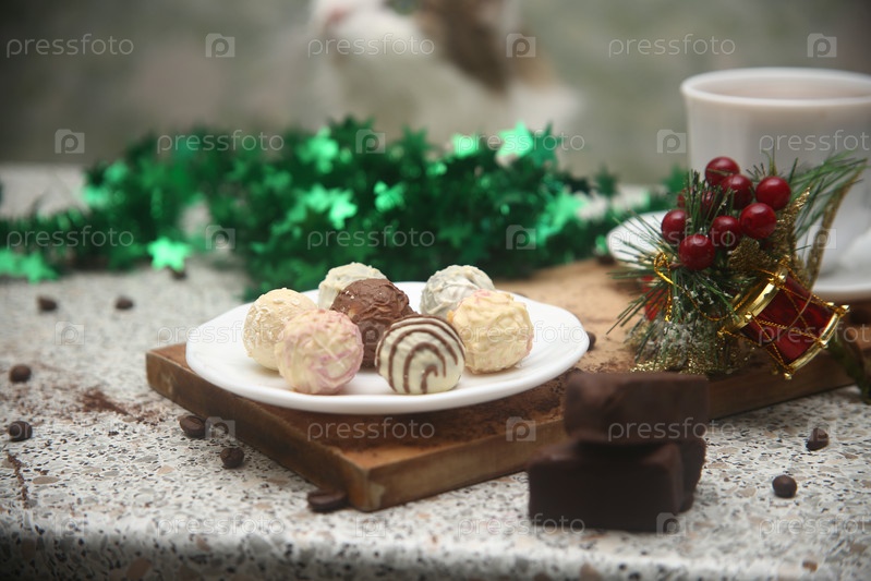 Шоколадные конфеты на доске, чашка кофе и новогодние украшения
