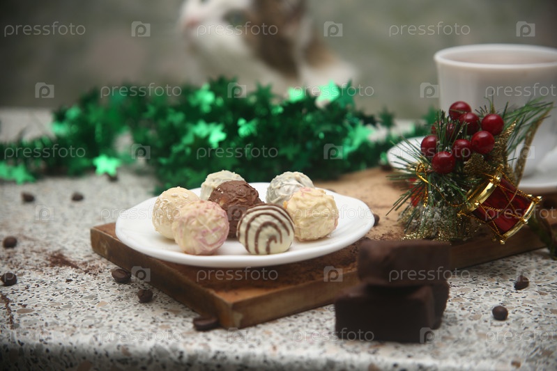 Шоколадные конфеты на доске, чашка кофе и новогодние украшения