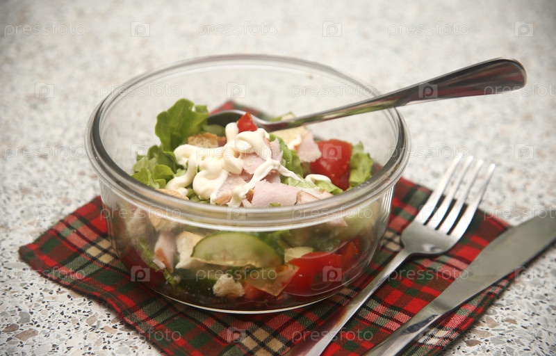 Салат с овощами и мясом в миске