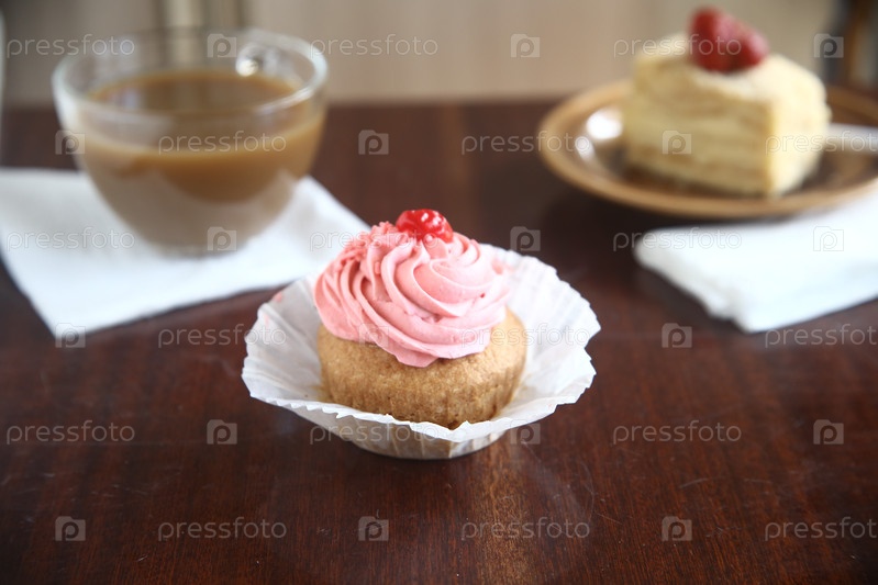 Вкусный кексы с сливками и вишней на столе