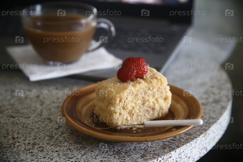 Кусок торта Наполеон со клубникой в тарелке