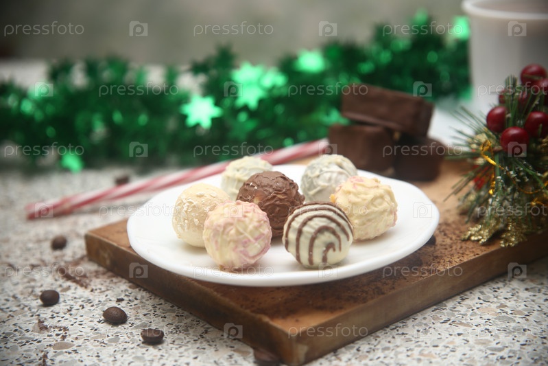 Шоколадные конфеты на доске, чашка кофе и новогодние украшения