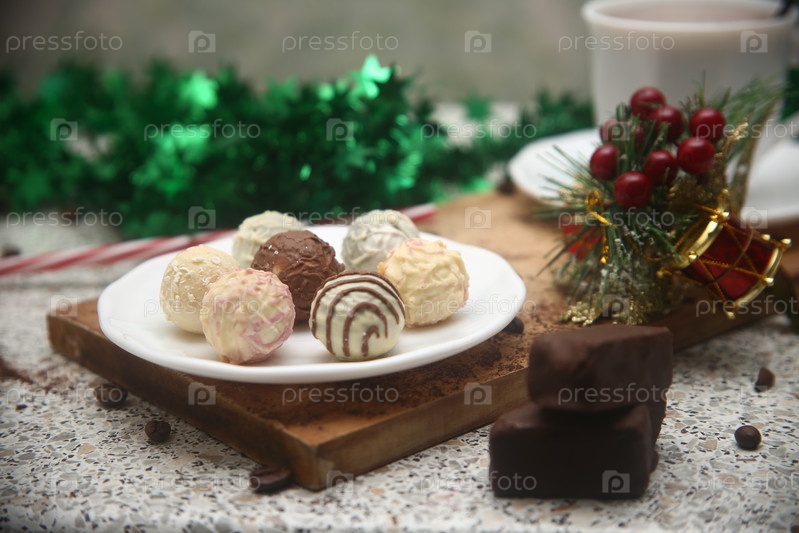 Шоколадные конфеты на доске, чашка кофе и новогодние украшения