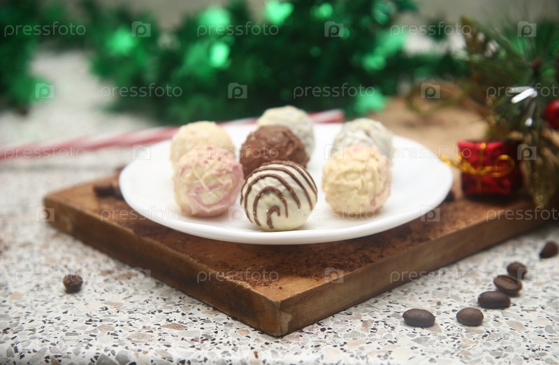 Шоколадные конфеты на доске, чашка кофе и новогодние украшения