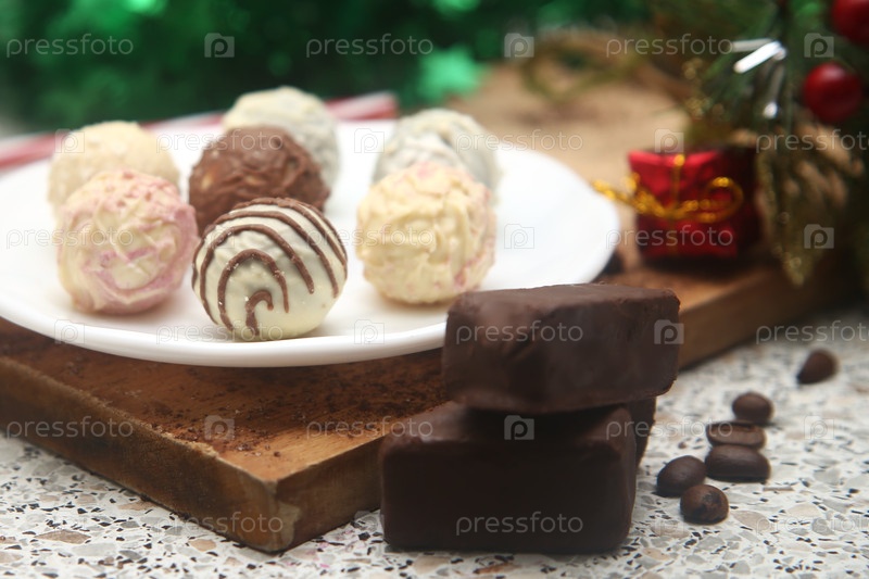 Шоколадные конфеты на доске, чашка кофе и новогодние украшения