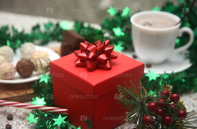 Подарок в красной коробке с тинзелем на новогоднем столе