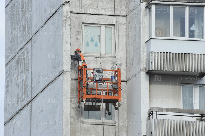 Сотрудники верхних лифтов выполняют фасадные работы в Москве