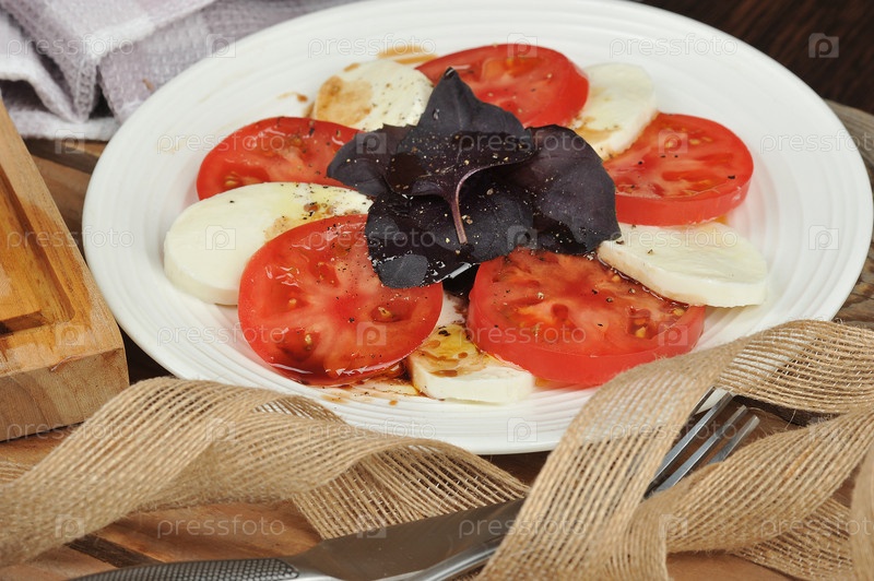 Салат каприз - помидоры, базилик и сыр моцарелла, оливковое масло