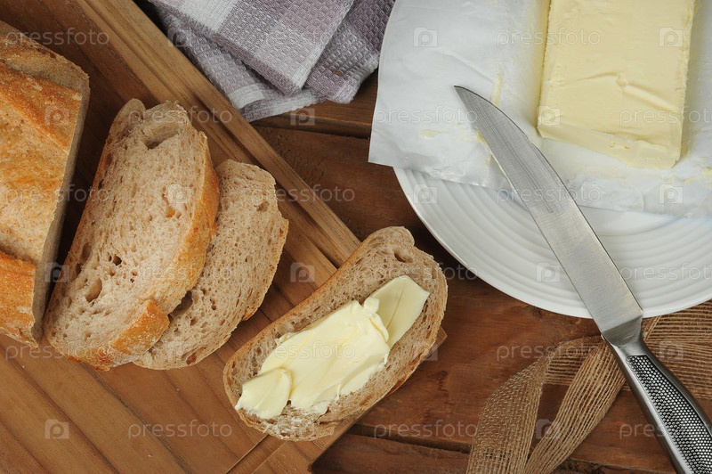 Сэндвич с маслом и хлебом на деревянном столе