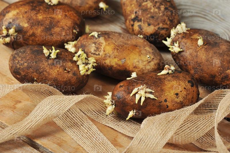 Картофельные клубни с прорастающими побегами на деревянном